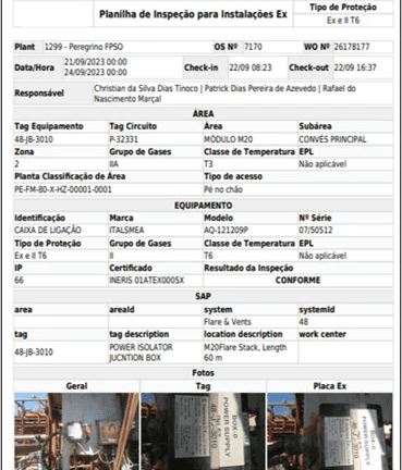 A plataforma digitalizou todo o fluxo de inspeção de equipamentos em áreas classificadas (Inspeções EX), permitindo: